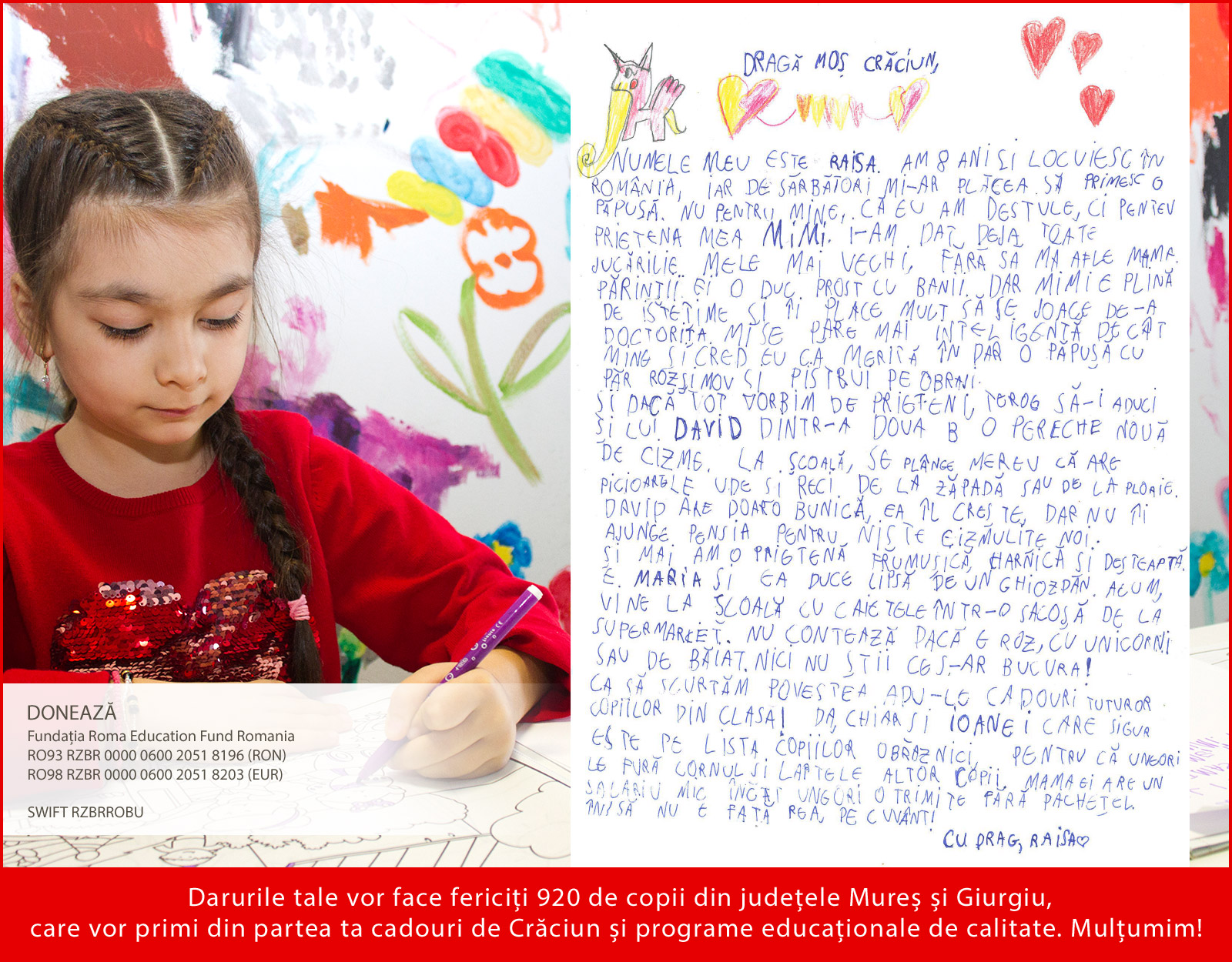 Dragă Moș Crăciun, Numele meu este Raisa. Am 8 ani și locuiesc în România, iar de sărbători mi-ar plăcea să primesc o păpuşă. Nu pentru mine, că eu am destule, ci pentru prietena mea Mimi. I-am dat deja toate jucăriile mele mai vechi, fără să mă afle mama. Părinții ei o duc prost cu banii. [Citește mai mult]
