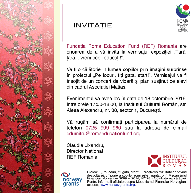 Fundația Roma Education Fund (REF) Romania are onoarea de a vă invita la vernisajul expoziției „Țară, țară… vrem copii educați!”.