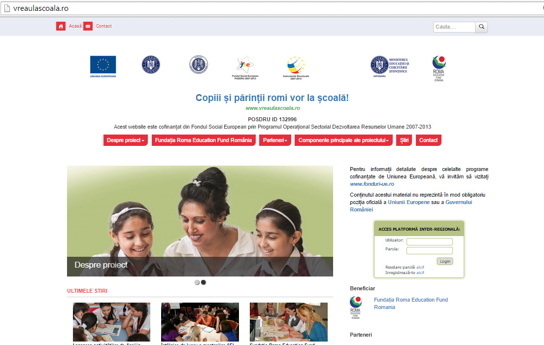Fundaţia Roma Education Fund România anunţă lansarea website-ului www.vreaulascoala.ro, principalul instrument de comunicare cu privire la derularea activităților din cadrul proiectului „Copiii şi părinţii romi vor la şcoală!” (POSDRU – ID 132996). Website-ul conţine informaţii relevante despre proiect, cum ar fi: obiectivele proiectului, activităţile, grupul ţintă, rezultatele anticipate şi parteneriatul proiectului. Periodic, pe website [Citește mai mult]