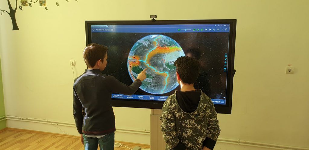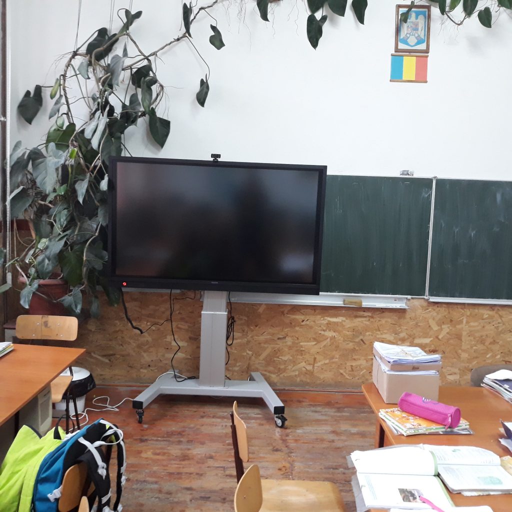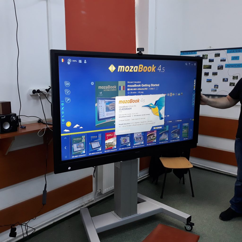 În toate cele șapte instituții școlare incluse în proiect, unde avem activități cu elevii, am instalat câte o tablă interactivă cu display interactiv mobil 65″, 4K UHD, newline multitouch, cu Windows 10 Pro și Mozabook Classroom.